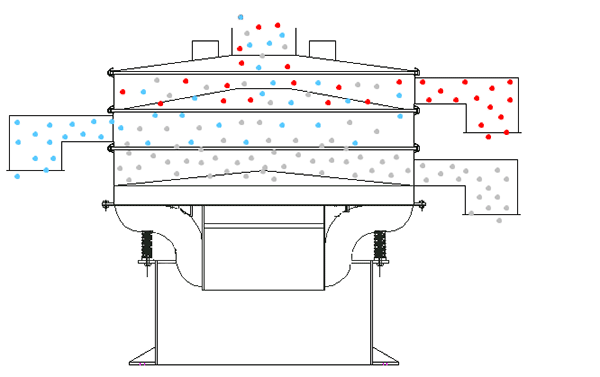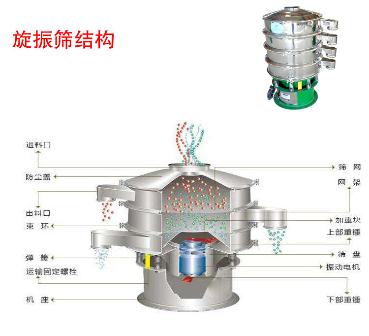 旋振篩是由直立式電機作激振源,電機上、下兩端安裝有偏心重錘,將電機的旋轉運動轉變?yōu)樗健⒋怪薄A斜的三次元運動,再把這個運動傳遞給篩面。調節(jié)上、下兩端的相位角,可以改變物料在篩面上的運動軌跡。
