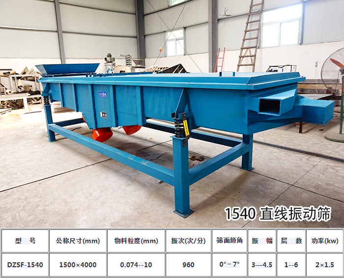 1540直線振動篩長為4000mm、寬為1500mm,它每小時可滿足3000KG左右產量需求。