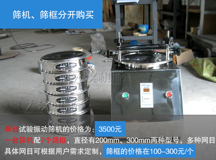 大漢機械生產的鹽土試驗振動篩可分為試驗篩機和試驗篩框,單臺試驗振動篩機的價格為:3500元,一臺篩機配7個篩框,直徑有200mm、300mm兩種型號,網目多種,具體網目可根據用戶需求定制,篩框的價格在100-300元/個,這兩種產品可以分開購買,所以這也是影響試驗篩價格的因素。
