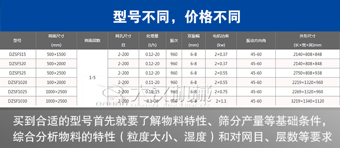 想要購買到合適的型號首先就要了解物料特性、篩分產(chǎn)量等基礎(chǔ)條件,綜合分析物料的特性(粒度大小、濕度)和對網(wǎng)目、層數(shù)等要求。要綜合考慮材質(zhì)、生產(chǎn)場地等條件。同時我們公司可以根據(jù)您的產(chǎn)量等要求為您推薦型號(DZSF-515、DZSF-520、DZSF-530、DZSF-1020、DZSF-1030、DZSF-1540等),同時大漢公司還支持設(shè)備特殊定做,為您定制專屬的篩分設(shè)備。