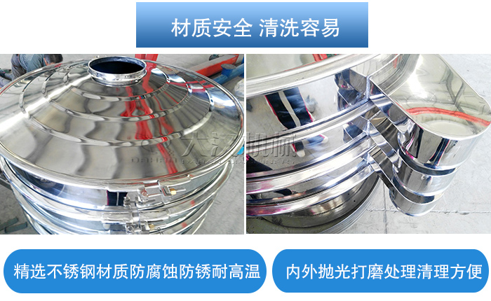 單層不銹鋼振動篩采用不銹鋼材質精制而成,具有良好的防腐蝕防銹功能,也可耐高溫,內外拋光打磨處理,內部無焊接點,表面平整無凹陷或高低起伏的波浪面,無扭曲變形的現象,增加篩分后清洗消毒的難度。
