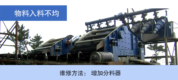 進入圓振篩的下料漏斗,是一個人字型的漏斗,而入料皮帶時常跑偏和漏斗積泥等原因,導致分料不均,從而致使一邊篩網嚴重過載,而另一邊篩網近乎空載運行,所以常造成篩網磨損不均破損較快。