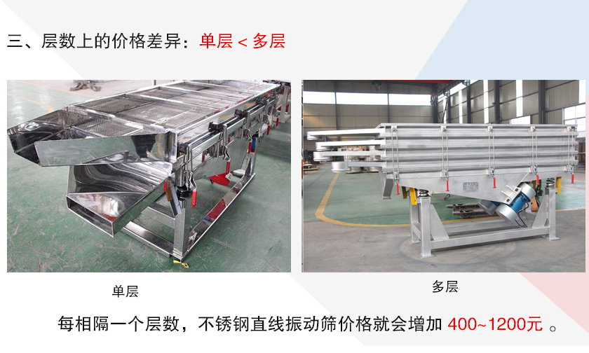 不銹鋼直線振動篩篩面層數(shù)可至5層,單層用于除雜,多層用于分選不同粒度規(guī)格的物料,主要是按照用戶自身的篩分目的來選擇,層數(shù)越高,制造成本就越大,所以價格一般就會越貴,在材質(zhì)、型號相同情況下,每相隔一個層數(shù),不銹鋼直線振動篩價格就會增加400~1200元。