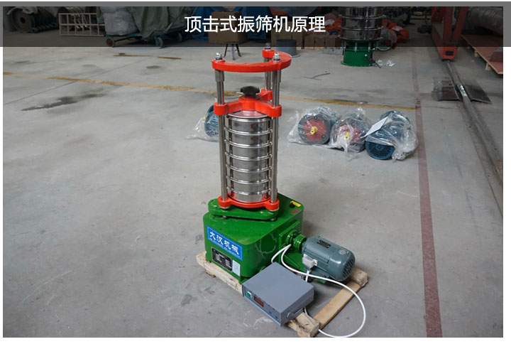 頂擊式振篩機結構由上部,中部,下部組成。上部主要是頂蓋,圓手柄,中部主要是螺桿和篩具,下部由定時器,振動電機和振動托盤組成,下部是發電和定時區,中部是篩分物料區,上部則是固定結構,輔助物料過濾區。