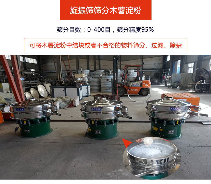 木薯淀粉材質細小,分散性比較大,采用旋振篩較為合適。旋振篩能夠篩分0-400目的物料,篩分精度可達95%、有效將木薯淀粉中結塊或者不合格的物料篩分、過濾、除雜,工作效率高。旋振篩根據要求有多種類型和款式,400型、800型、1000型等任由用戶選擇,層數也可定制。網孔不堵塞,整機密封嚴謹木薯粉不外濺,自動化排料,篩分木薯粉時透網率高,且其體積小、節省占地面積,移動方便。