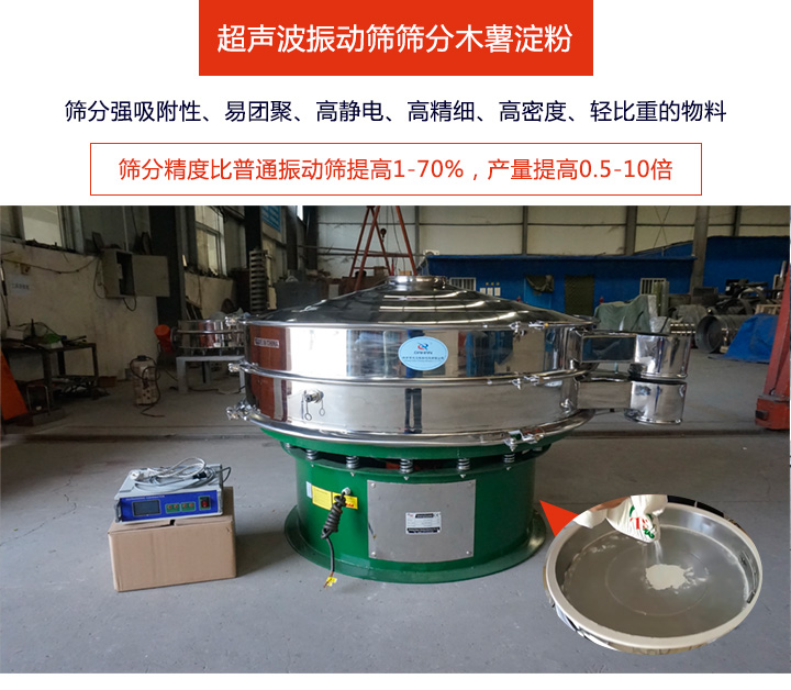 超聲波振動篩相當于升級版的旋振篩,因加入超聲波篩分系統,它可以解決精細粉末因強吸附性、易團聚、高靜電、高精細、高密度、輕比重等篩分問題,尤其適合木薯淀粉的篩分。超聲波振動篩篩分效率高、不堵網,篩分精度比普通振動篩可提高1-70%,產量可提高0.5-10倍,可單層使用,也可多層使用。